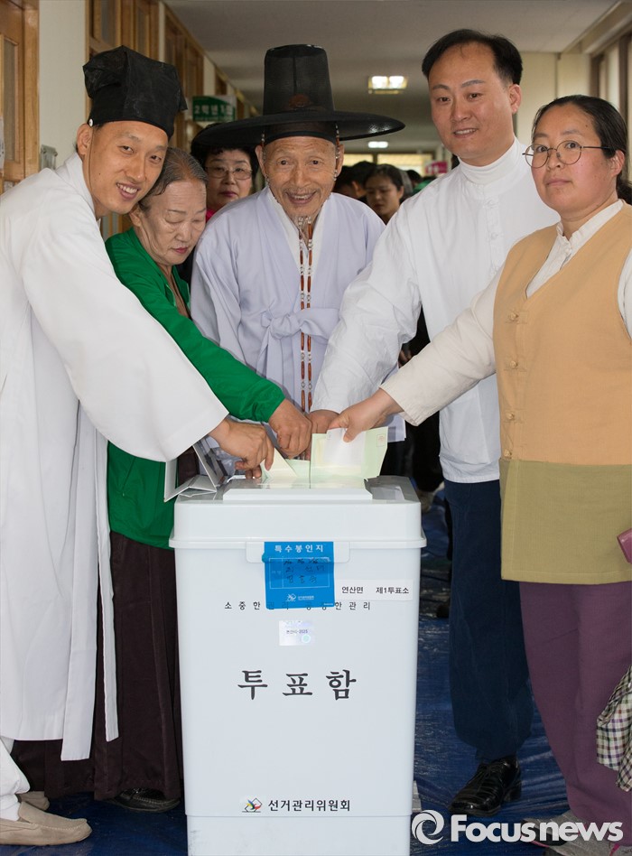 (논산=포커스뉴스) 제20대 국회의원 선거가 시작된 13일 오전 충남 논산 연산면 제1투표소에서 양지서당 유복엽 큰 훈장과 가족들이 투표하고 있다.