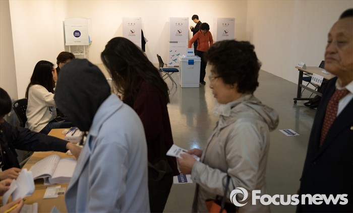 (서울=포커스뉴스) 2016 제20대 국회의원선거날인 13일 오전 서울 종로구 동성고등학교 백주년기념관에 설치된 투표소에서 유권자들이 투표를 하기 위해 본인확인을 하고 있다.