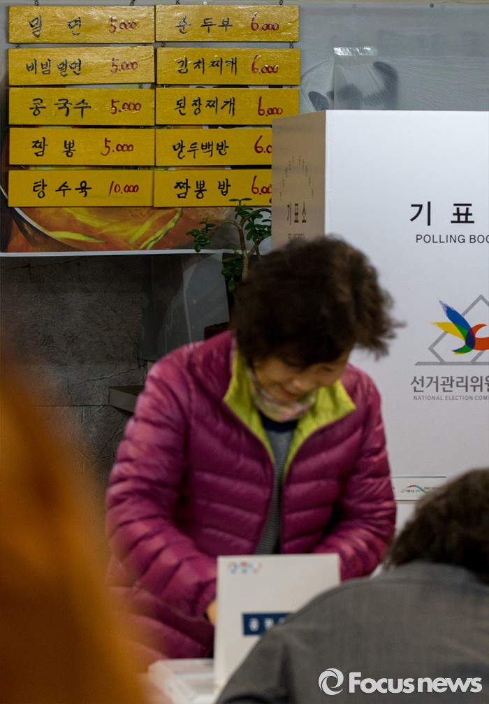 (부산=포커스뉴스) 제20대 국회의원선거일인 13일 오전 부산 사하구 하단1동 제1투표소에서 유권자들이 투표하고 있다. 이 투표소는 하단전통시장 내 한 밀면 음식점에 마련됐다.