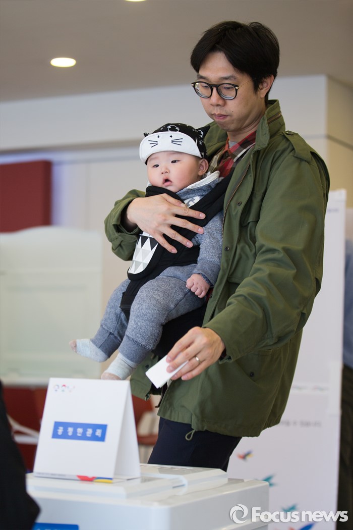 제 20대 총선의 유권자 수는 총 4210만398명이다. 자신의 지역구별 투표장은 선관위 홈페이지를 통해 확인할 수 있다. (선관위 홈페이지-투표장 확인하기)(서울=포커스뉴스) 제20대 국회의원선거일인 13일 오전 서울 광진구 능동 제3투표소에서 한 유권자가 아이와 함께 투표하고 있다. 2016.04.13 오장환 기자