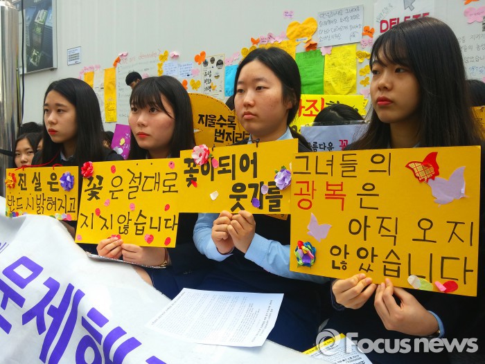 경기 부천 부명고 3학년 안주원(18)양은 "이 순간 누군가는 소녀상 철폐를 요구하고, 누군가는 위안부의 존재 자체를 부인하며, 가장 힘이 돼야할 누군가는 도리어 이를 '최종적이고 불가역적'이라며 마무리지으려 한다"며 "앞으로 살아있는 역사를 배워 할머니들을 위해 함께 싸우겠다"고 포부를 밝혔다.