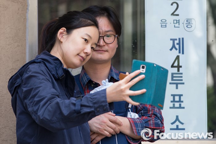 (서울=포커스뉴스) 2016 제20대 국회의원선거날인 13일 오후 서울 서초구 서이초등학교에 마련된 투표소에서 유권자들이 투표를 마치고 인증샷을 찍고 있다.