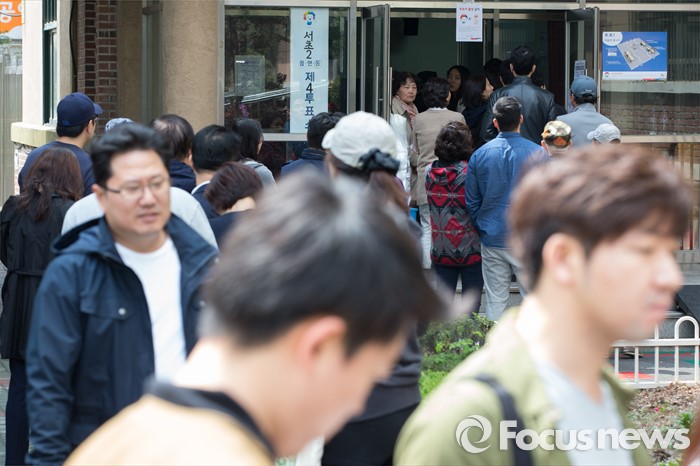 (서울=포커스뉴스) 2016 제20대 국회의원선거날인 13일 오후 서울 서초구 서이초등학교에 마련된 투표소에서 유권자들이 투표를 하기 위해 대기하고 있다.
