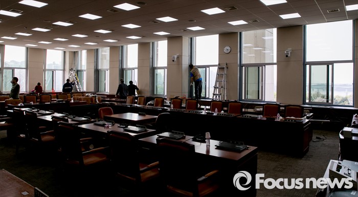 (서울=포커스뉴스) 20대 총선 투표일인 13일 오후 서울 여의도 국회 본청에서 업체 관계자들이 창문교체 작업을 하고 있다.