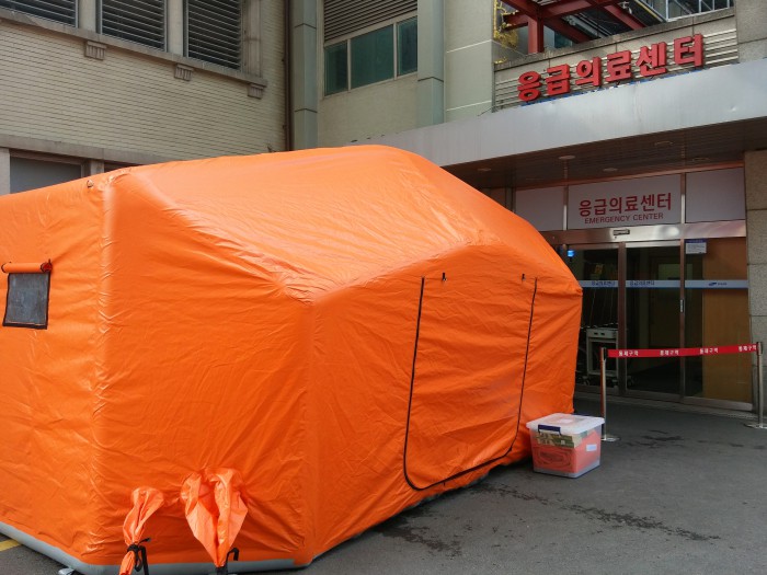 강북삼성병원 응급실 앞에는 현재 가로 3m, 세로 5m 크기의 음압텐트가 설치돼 있고 응급환자를 받고 있지 않는 상황이다.