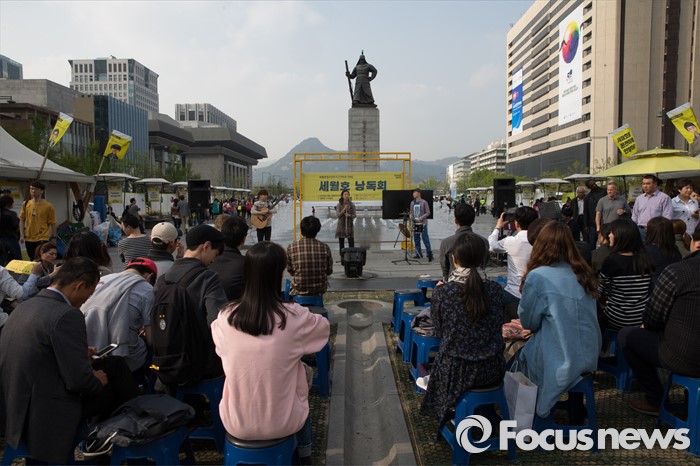 (서울=포커스뉴스) 제20대 국회의원선거날인 13일 오후 서울 종로구 광화문 광장에서 세월호 2주기 추모행사 세월호 낭독회가 열리고 있다.