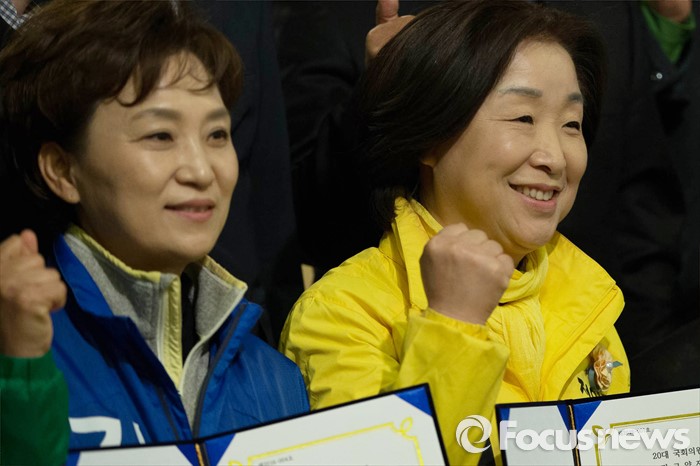 (서울=포커스뉴스) 13일 오후 6시 KBS·MBC·SBS 지상파 방송3사가 공동조사, 발표한 4·13 총선 출구조사 결과에 따르면 경기 고양정 지역구에서는 더불어민주당 김현미후보가 52.3%로 우세한 것으로 나타났다.(고양=포커스뉴스) 20대 총선을 일주일 앞둔 6일 오전 고양시 일산동구의 한 교회에서 열린 '100만고양자치연대' 좋은후보 추천식에 참석한 심상정(오른쪽) 정의당 고양시갑 후보와 김현미 더불어민주당 고양시정 후보가 추천서를 들고 기념촬영 하고 있다. 2016.04.06 이승배 기자