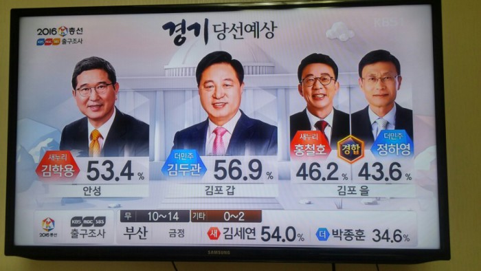 (서울=포커스뉴스)13일 오후 6시 KBS·MBC·SBS 지상파 방송3사가 공동조사, 발표한 4·13 총선 출구조사 결과에 따르면 경기 김포갑에서는 더불어민주당 김두관 후보가 56.9%로 당선이 유력한 것으로 나타났다.<사진출처=KBS 캡쳐>