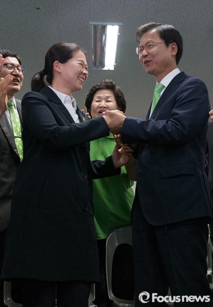 (광주=포커스뉴스) 제20대 국회의원 선거일인 13일 오후 광주 서구 국민의당 광주광역시당에서 천정배 국민의당 공동대표와 권은희 국민의당 광산구을 후보가 출구조사 결과를 보고 환호하고 있다.