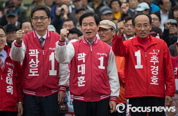 (서울=포커스뉴스) 13일 오후 6시 KBS·MBC·SBS 지상파 방송3사가 공동조사, 발표한 4·13 총선 출구조사 결과에 따르면 대구 달서갑에서 새누리당 곽대훈 후보가 70.6%로 당선이 유력한 것으로 나타났다.(대구=포커스뉴스) 새누리당 대구지역 후보자들이 6일 오후 대구광역시 달서구 성당동 일대에서 대구지역 후보자 총집결 거리유세를 하고 있다. 오른쪽부터 추경호 달성군 후보, 곽대훈 달서구갑 후보, 곽상도 중구남구 후보 2016.04.06 김흥구 기자