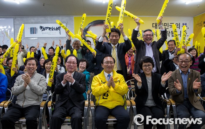 (창원=포커스뉴스) 제20대 국회의원선거가 끝난 13일 오후 창원시 성산구의 선거사무소에서 노회찬 정의당 창원 성산구 후보가 '예측 당선'이라는 방송사 출구조사 결과에 지지자들과 함께 기쁨을 표하고 있다. 노 후보의 좌측은 권영길 전 민주노동당 대표, 우측은 부인 김지선 씨.