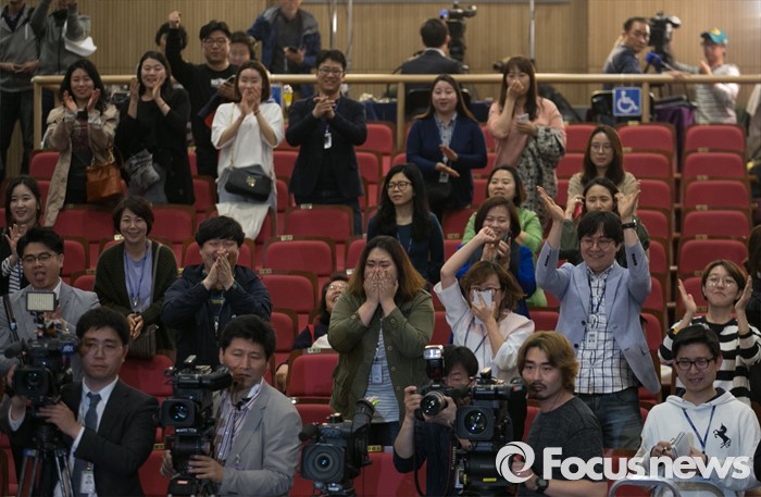 (서울=포커스뉴스) 20대 총선 투표일인 13일 오후 서울 여의도 국회 의원회관 대회의실에 마련된 더불어민주당 개표상황실에서 당직자 및 관계자들이 개표방송을 시청하며 환호하고 있다.
