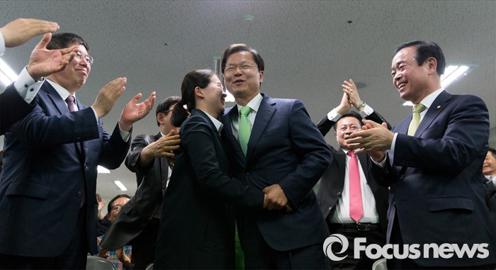 (광주=포커스뉴스) 제20대 국회의원 선거일인 13일 오후 광주 서구 국민의당 광주광역시당에서 천정배 국민의당 공동대표와 권은희 국민의당 광산구을 후보가 출구조사 결과를 보고 환호하고 있다.