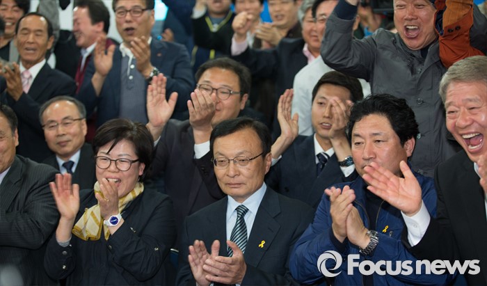 (세종=포커스뉴스) 제20대 국회의원선거가 마감된 가운데 이해찬 무소속 후보가 13일 오후 세종시 도담동 선거사무소에서 방송3사 출구조사 결과 앞서는 것으로 나타나자 지지자들과 함께 환호하고 있다.