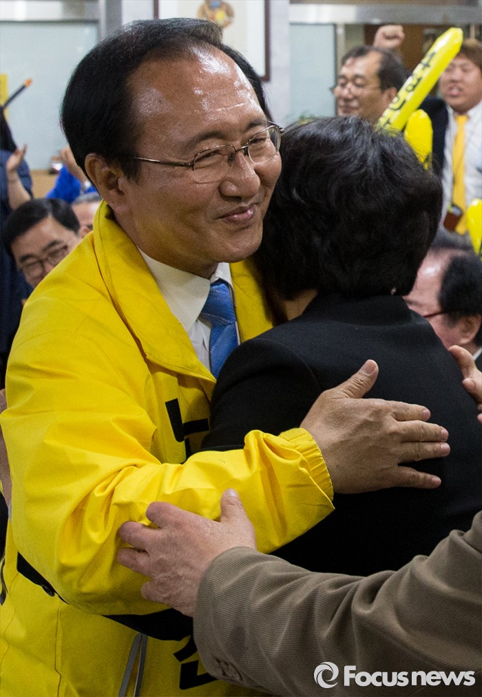 (창원=포커스뉴스) 제20대 국회의원선거가 끝난 13일 오후 창원시 성산구의 선거사무소에서 노회찬 정의당 창원 성산구 후보가 '예측 당선'이라는 방송사 출구조사 결과가 나오자 부인 김지선씨와 포옹하고 있다.