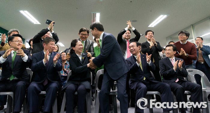 (광주=포커스뉴스) 제20대 국회의원 선거일인 13일 오후 광주 서구 국민의당 광주광역시당에서 천정배 국민의당 공동대표와 권은희 국민의당 광산구을 후보가 출구조사 결과를 보고 환호하고 있다.