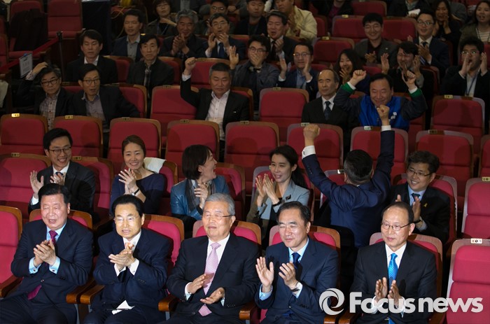(서울=포커스뉴스) 20대 총선 투표일인 13일 오후 서울 여의도 국회 의원회관 대회의실에 마련된 더불어민주당 개표상황실에서 김종인 비대위 대표 겸 선대위원장과 선대위원들이 출구조사 및 개표방송을 시청하며 박수치고 있다. 앞줄 왼쪽부터 이근식, 송현섭 부위원장, 김 대표, 정장선 총선기획단장, 최운열 국민경제상황실장.