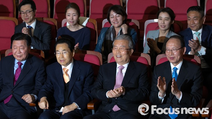 (서울=포커스뉴스) 20대 총선 투표일인 13일 오후 서울 여의도 국회 의원회관 대회의실에 마련된 더불어민주당 개표상황실에서 김종인 비대위 대표 겸 선대위원장과 선대위원들이 출구조사 및 개표방송을 시청하며 박수치고 있다. 앞줄 왼쪽부터 이근식, 송현섭 부위원장, 김 대표, 최운열 국민경제상황실장.