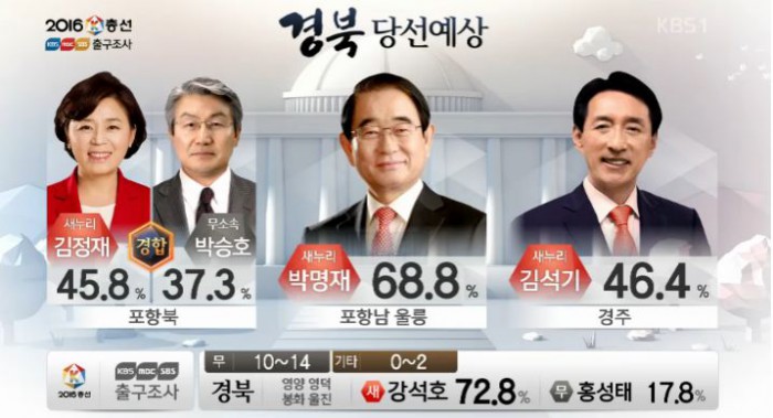 (서울=포커스뉴스)13일 오후 6시 KBS·MBC·SBS 지상파 방송3사가 공동조사, 발표한 4·13 총선 출구조사 결과에 따르면 경북 경주 지역구에서는 김석기 새누리당 후보가 46.4%로 당선이 유력한 것으로 나타났다.<사진출처=KBS 출구방송 화면캡쳐>