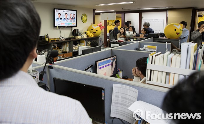 (서울=포커스뉴스) 2016 제20대 국회의원선거날인 13일 오후 서울 영등포구 정의당사에서 관계자들이 방송사들의 출구조사 결과를 지켜보고 있다.