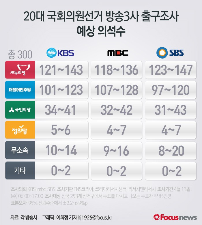 (서울=포커스뉴스) 20대 국회의원선거 방송3사 공동 출구조사 정당별 예상 의석수.