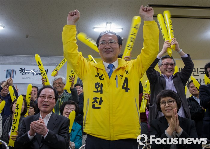 (창원=포커스뉴스) 제20대 국회의원선거가 끝난 13일 오후 창원시 성산구의 선거사무소에서 노회찬 정의당 창원 성산구 후보가 '예측 당선'이라는 방송사 출구조사 결과에 두 손을 번쩍 들고 있다. 노 후보의 좌측은 권영길 전 민주노동당 대표, 우측은 부인 김지선 씨.