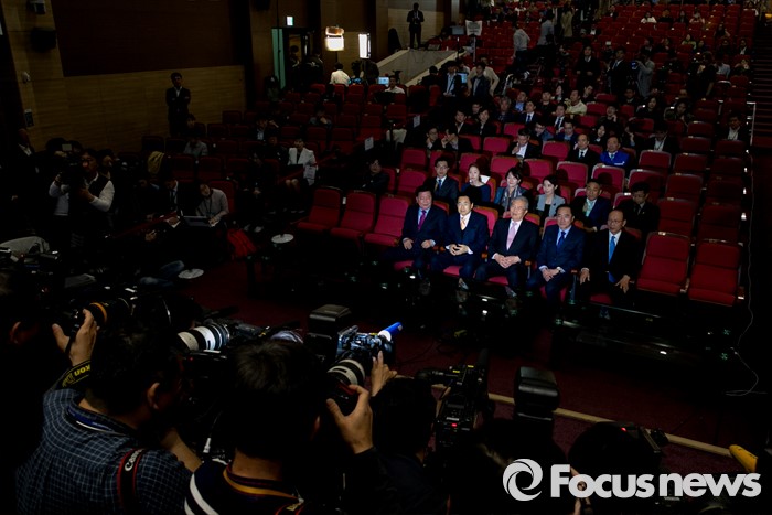 (서울=포커스뉴스) 20대 총선 투표일인 13일 오후 서울 여의도 국회 의원회관 대회의실에 마련된 더불어민주당 개표상황실에서 김종인 비대위 대표 겸 선대위원장 등 선대위원들이 출구조사 및 개표방송을 시청하고 있다.