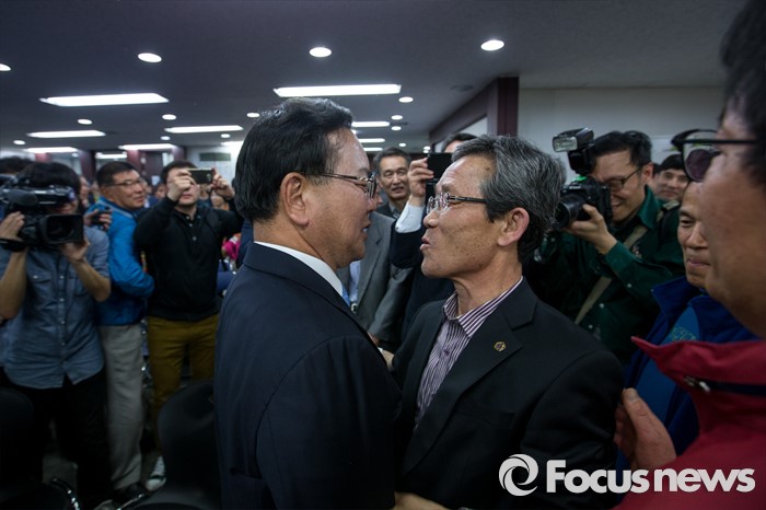 (대구=포커스뉴스) 제20대 국회의원선거 출구조사를 통해 김부겸 더불어민주당 대구 수성갑 후보가 김문수 새누리당 대구 수성갑 후보를 제치고 당선이 예측된 13일 오후 대구 수성구 김 후보 선거사무소에서 김부겸 후보가 지지자와 포옹하고 있다.