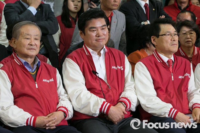 (서울=포커스뉴스) 제20대 국회의원 선거날인 13일 오후 서울 여의도 새누리당사에서 원유철(가운데) 원내대표와 강봉균(왼쪽) 공동선대위원장, 이군현 공동총괄본부장이 방송 3사의 출구조사를 시청하고 있다.