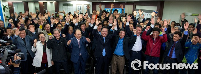 (대구=포커스뉴스) 제20대 국회의원선거 출구조사를 통해 김부겸 더불어민주당 대구 수성갑 후보가 김문수 새누리당 대구 수성갑 후보를 제치고 당선이 예측된 13일 오후 대구 수성구 김 후보 선거사무소에서 김부겸 후보가 지지자들과 만세를 외치고 있다.