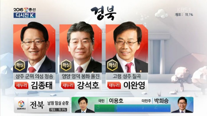 13일 오후 8시 23분 KBS는 경북 영양·영덕·봉화·울진의 강석호 새누리당 후보가 당선이 확실하다고 밝혔다.<사진출처=KBS 방송 화면캡쳐>