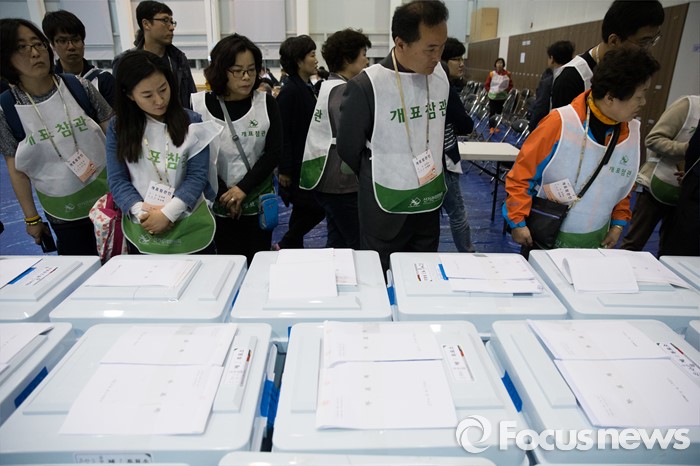 (서울=포커스뉴스) 제20대 국회의원선거일인 13일 오후 서울 은평다목적체육관에 마련된 개표소에서 개표 참관인들이 투표함을 검토하고 있다.