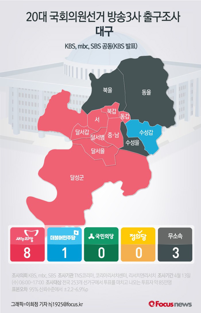 (서울=포커스뉴스) KBS·mbc·SBS 지상파 방송 3사 공동 출구조사 결과 대구에서 새누리당은 8곳, 무소속 3곳, 더불어민주당이 1곳에서 우세를 예측했다.