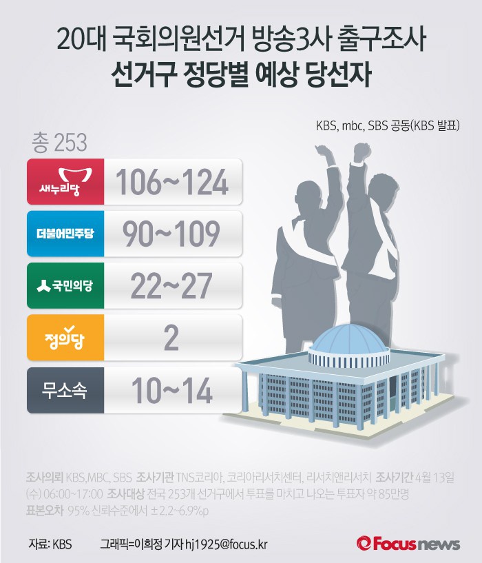 경합 지역은 4개 지역으로 나타났다.(서울=포커스뉴스) KBS발표 20대 국회의원선거 방송3사 공동 출구조사 선거구 정당별 예상 당선자 비교. 2016.04.13 이희정 기자