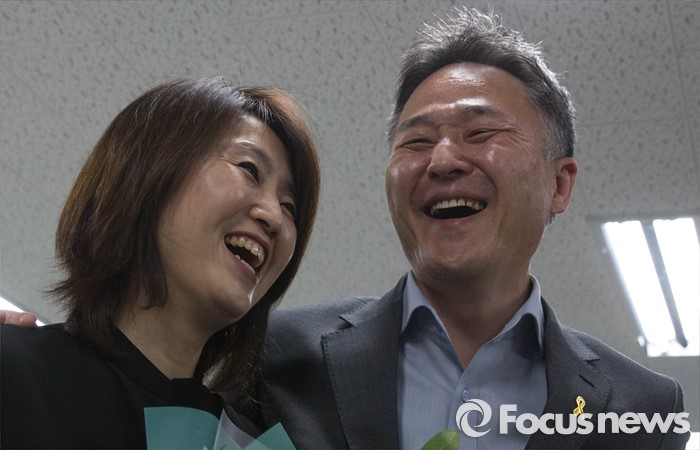 | △ '당선유력' 소식에 부인과 활짝 웃는 표창원 |
