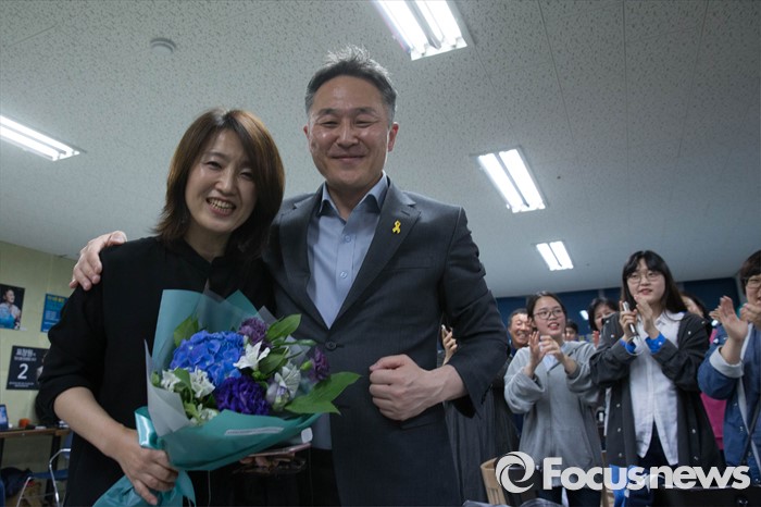 (용인=포커스뉴스) 제20대 국회의원 선거날인 13일 오후 경기도 용인시 기흥에 위치한 선거사무실에서 표창원 더불어민주당 용인정 후보가 '당선유력' 이라는 방송사 개표 상황을 확인하고 부인 이승아씨와 함께 기쁨을 나누고 있다.