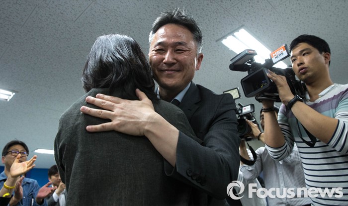 (용인=포커스뉴스) 제20대 국회의원 선거날인 13일 오후 경기도 용인시 기흥에 위치한 선거사무실에서 표창원 더불어민주당 용인정 후보가 '당선유력' 이라는 방송사 개표 상황을 확인하고 지지자들의 축하를 받고 있다.