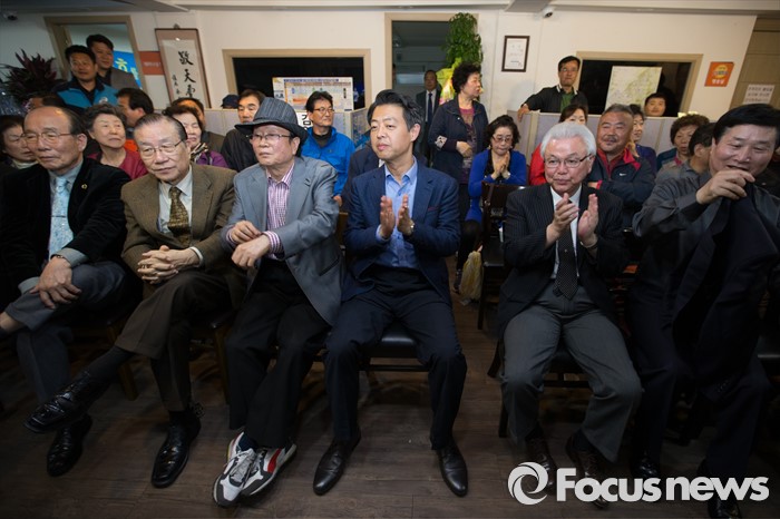 (서울=포커스뉴스) 13일 오후 서울 서대문구 김영호 더불어민주당 서대문구을 후보의 사무실에서 김후보가 지지자들과 함께 개표방송을 보며 박수를 치고 있다.