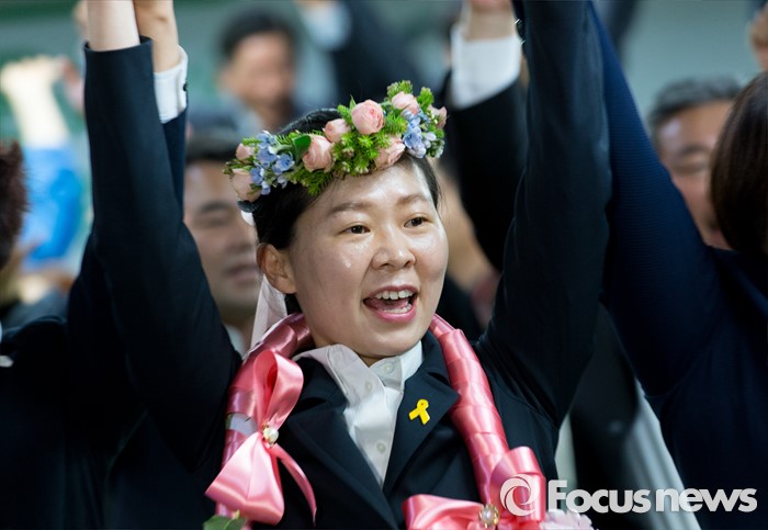 (광주=포커스뉴스) 권은희 국민의당 광주 광산구을 후보가 13일 오후 광주 광산구 수완동 선거사무실에서 당선이 유력해지자 지지자들과 환호하고 있다.