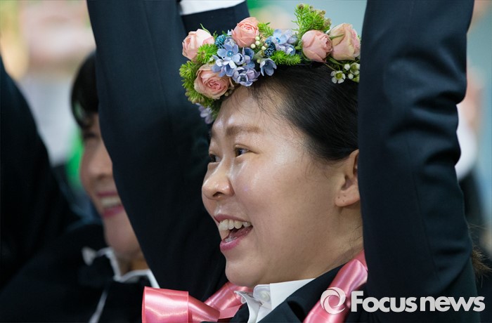 (광주=포커스뉴스) 권은희 국민의당 광주 광산구을 후보가 13일 오후 광주 광산구 수완동 선거사무실에서 당선이 유력해지자 지지자들과 환호하고 있다.