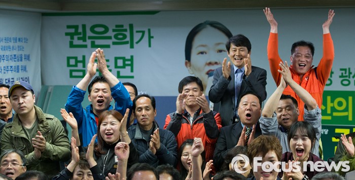(광주=포커스뉴스) 13일 오후 광주 광산구 수완동 권은희 국민의당 광주 광산구을 후보 선거사무실에서 권 후보의 당선이 유력해지자 지지자들이 환호하고 있다.
