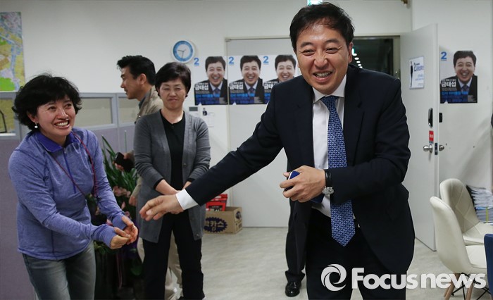 (서울=포커스뉴스) 제20대 국회의원 선거날인 13일 오후 서울 강서구에 위치한 선거사무실에서 금태섭 더불어민주당 강서갑 후보가 지지자들과 인사를 하고 있다.