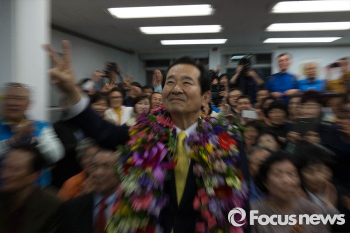 (서울=포커스뉴스) 제20대 국회의원선거일인 13일 오후 정세균 더불어민주당 종로구 후보가 서울 종로구 자신의 사무실에서 53.9%의 득표로 오세훈 새누리당 후보를 누르고 당선이 확실시 되자 세리머니를 하고 있다.