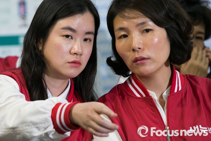 (서울=포커스뉴스) 제20대 국회의원 선거날인 13일 오후 서울 여의도 새누리당사에서 전희경(오른쪽), 신보라 비례대표 후보들이 대화하고 있다.