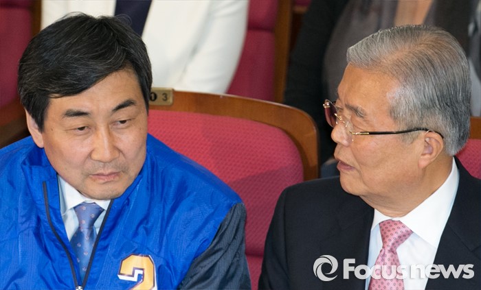 (서울=포커스뉴스) 20대 총선 투표일인 13일 오후 서울 여의도 국회 의원회관 대회의실에 마련된 더불어민주당 개표상황실에서 김종인(오른쪽) 비대위 대표 겸 선대위원장과 이종걸 원내대표가 대화하고 있다.