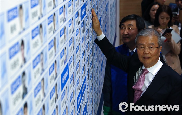 (서울=포커스뉴스) 20대 총선 투표일인 13일 오후 서울 여의도 국회 의원회관 대회의실에 마련된 더불어민주당 개표상황실에서 김종인(오른쪽) 비대위 대표 겸 선대위원장, 이종걸 원내대표가 당선이 확정된 이언주 경기 광명을 후보의 사진 옆에 당선 스티커를 부착하고 있다.