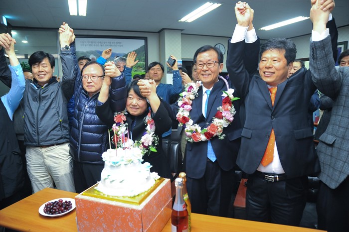 | △ 지지자들과 환호하는 원혜영 후보 부부 |