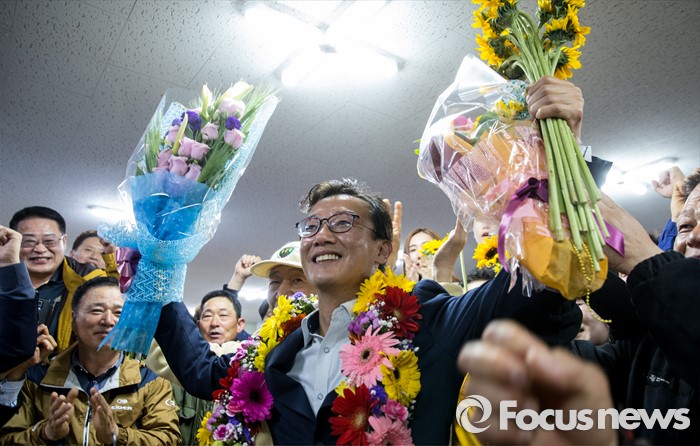 (부산=포커스뉴스) 전재수 더불어민주당 부산 북구강서구갑 후보가 13일 오후 부산 북구 선거사무소에서 당선이 확실시되자 지지자들과 함께 기쁨을 나누고 있다.