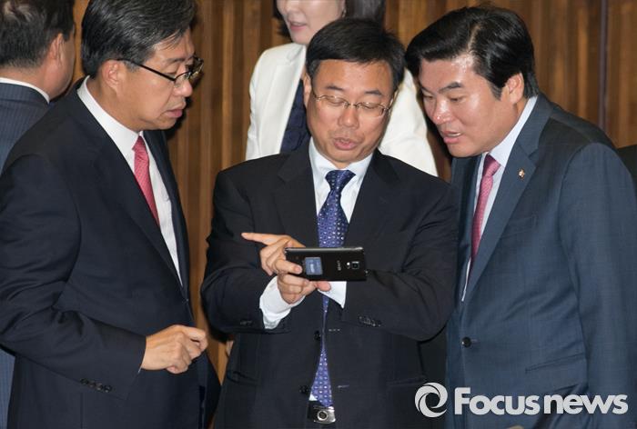 (서울=포커스뉴스) 13일 오후 23시08분 KBS는 개표율 68.6% 현재 경기 성남 중원 지역구 새누리당 신상진 후보가 44.4%를 득표해 당선이 확실하다고 밝혔다.(서울=포커스뉴스) 1일 오후 서울 여의도 국회에서 열린 337회 국회(정기회) 개회식에 참석한 원유철(오른쪽부터) 새누리당 원내대표, 신상진, 전하진 의원이 핸드폰을 보며 대화하고 있다. 2015.09.01 박동욱 기자