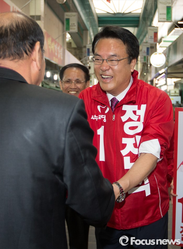 (서울=포커스뉴스)13일 오후 11시 16분 KBS는 개표율 76.7% 현재 충남 공주·부여·청양 새누리당 정진석 후보가 득표율 50.1%로 당선이 확실하다고 밝혔다.(공주=포커스뉴스) 1일 충남 공주시 산성시장 일원에서 정진석 새누리당 후보가 지지를 호소하고 있다.2016.04.01